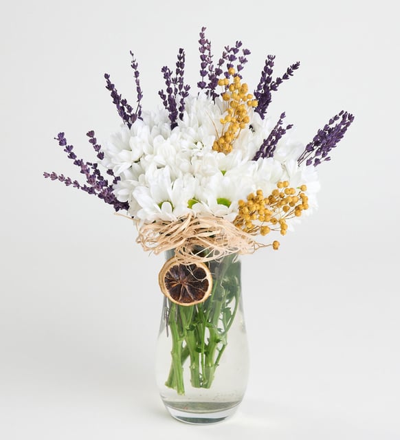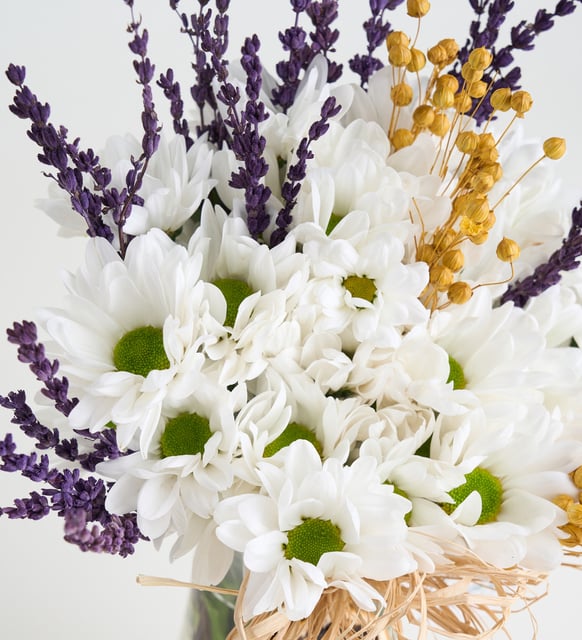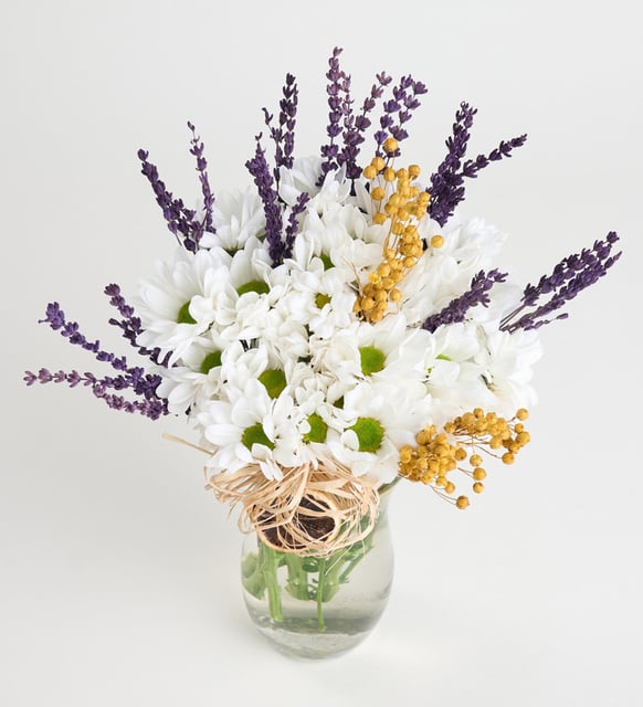 Beyaz papatyalar, doğallığı ve zarafetiyle sevgi dolu anların en anlamlı çiçeklerindendir. Cam vazoda sunulan bu 20 adet beyaz papatya, lavantanın büyüleyici kokusuyla birleşerek hem gözlere hem de ruhlara hitap eder. Saflık ve masumiyeti sembolize eden papatyalar, en içten duygularınızı dile getirmenin en güzel yoludur. Sevdiklerinize göndereceğiniz bu şık aranjman, sıradan bir günü unutulmaz kılmak için mükemmel bir seçim olabilir. Beyaz papatyaların saf görünümüyle lavantanın hoş kokusu, huzur dolu bir atmosfer yaratırken, cam vazo sayesinde dekoratif bir dokunuş da sunar. Özel anlarda ya da sadece sevdiklerinizi gülümsetmek istediğinizde tercih edebileceğiniz bu papatya buketi, hislerinizi kelimelere dökemediğiniz anlarda en güzel şekilde ifade etmenizi sağlar. Siparişiniz sonrasında çıkacak “Not oluşturma” sayfasında birkaç cümlelik not oluşturarak hediyenizi daha anlamlı bir hale getirmeyi unutmayın.